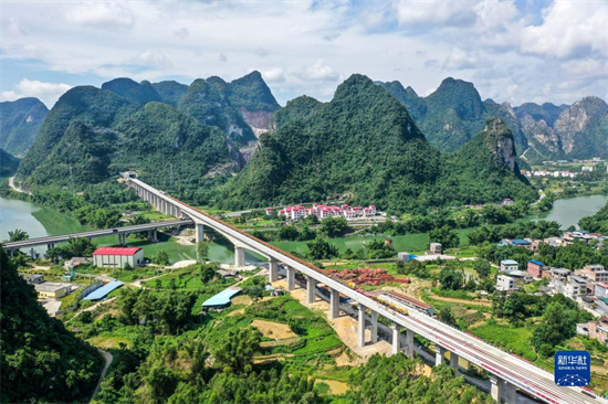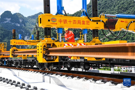 當(dāng)日,在廣西河池市,一臺鋪軌機將一段500米長鋼軌鋪設(shè)在貴南高鐵龍江雙線特大橋的無砟道床上,標(biāo)志著貴南高鐵正式進入鋪軌階段。建設(shè)中的貴南高鐵是我國“八縱八橫”高速鐵路主通道包頭至海口通道的重要組成部分,設(shè)計時速350公里。
