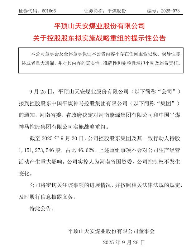平煤股份9月25日晚間公告稱,公司接到控股股東中國平煤神馬集團(tuán)通知,河南省委、省政府決定對河南能源集團(tuán)和中國平煤神馬集團(tuán)實(shí)施戰(zhàn)略重組。截至9月20日,中國平煤神馬集團(tuán)及其一致行動(dòng)人持股約為11.51億股,占比46.62%。上述重組事項(xiàng)不會對公司生產(chǎn)經(jīng)營活動(dòng)產(chǎn)生重大影響。公司實(shí)控人為河南省國資委,公司控制權(quán)不發(fā)生變化。