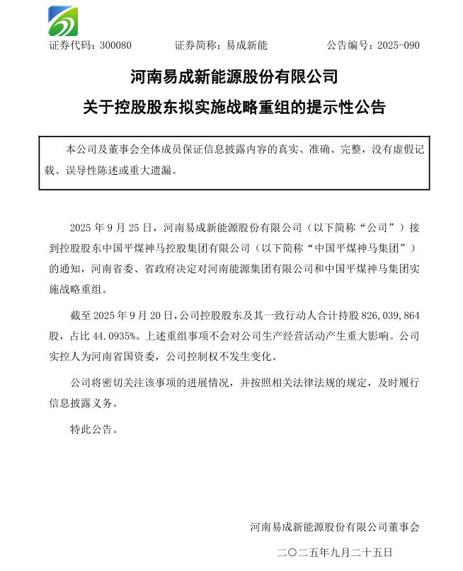 易成新能9月25日晚間公告稱,公司接到控股股東中國平煤神馬集團(tuán)的通知,河南省委、省政府決定對河南能源集團(tuán)和中國平煤神馬集團(tuán)實(shí)施戰(zhàn)略重組。截至9月20日,中國平煤神馬集團(tuán)及其一致行動(dòng)人合計(jì)持股約為8.26億股,占比44.0935%。上述重組事項(xiàng)不會對公司生產(chǎn)經(jīng)營活動(dòng)產(chǎn)生重大影響。公司實(shí)控人為河南省國資委,公司控制權(quán)不發(fā)生變化。