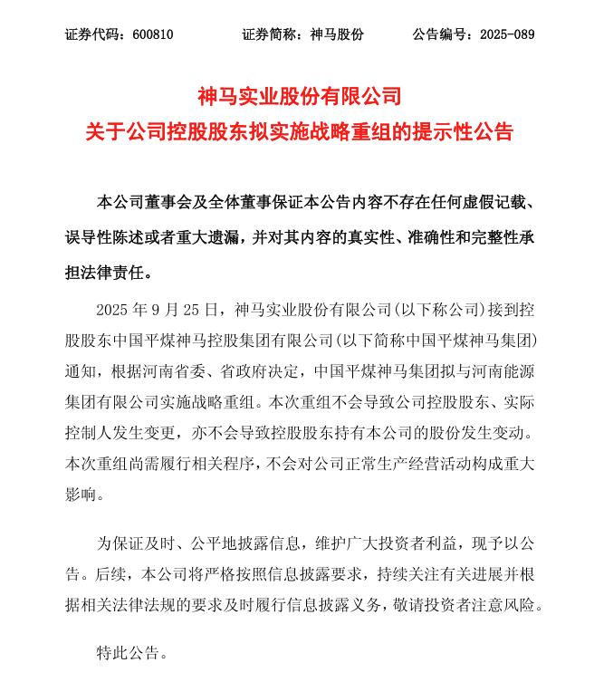 神馬股份9月25日晚間公告稱,公司接到控股股東中國平煤神馬集團(tuán)通知,根據(jù)河南省委、省政府決定,中國平煤神馬集團(tuán)擬與河南能源集團(tuán)實(shí)施戰(zhàn)略重組。本次重組不會導(dǎo)致公司控股股東、實(shí)際控制人發(fā)生變更,也不會導(dǎo)致控股股東持有公司的股份發(fā)生變動(dòng)。本次重組尚需履行相關(guān)程序,不會對公司正常生產(chǎn)經(jīng)營活動(dòng)構(gòu)成重大影響。