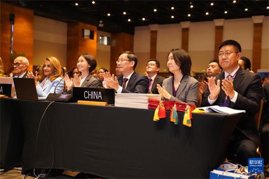12月4日,在巴拉圭亞松森拍攝的聯(lián)合國教科文組織保護(hù)非物質(zhì)文化遺產(chǎn)政府間委員會(huì)第19屆常會(huì)評(píng)審現(xiàn)場,中國代表團(tuán)慶祝春節(jié)申遺成功。新華社記者 朱雨博 攝