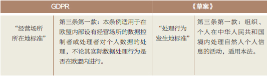 GDPR “經(jīng)營場所所在地標準”和《草案》“處理行為發(fā)生地標準” 的相關(guān)規(guī)定詳見上表:
