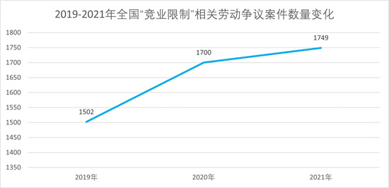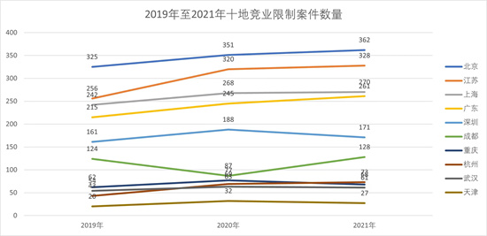 通過“中國裁判文書網”檢索,2019年至2021年,北京、上海、廣東、深圳、江蘇、天津、重慶、成都、杭州、武漢十地共有競業(yè)限制爭議案件4951件。其中,2019年1502件,2020年1700件,2021年1749件。