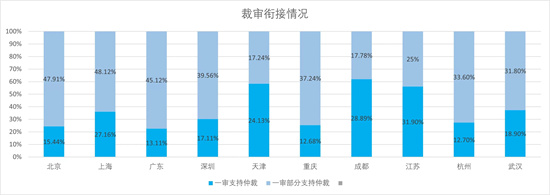 從以上圖表可以看出,在仲裁與一審的銜接程序中,一審支持或部分支持仲裁裁決結果的比例在50%至75%,上海、北京、廣東分別占支持或部分支持仲裁裁決結果的前三名,分別占比75.28%、63.35%、58.23%。