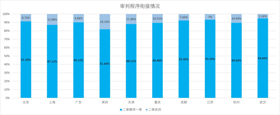 在一審與二審的訴訟銜接程序中,二審維持一審判決結果的比例均在80%以上。