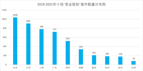 據(jù)統(tǒng)計,在檢索的十地范圍內,競業(yè)限制案件多發(fā)于北京、江蘇、上海、廣東、深圳等經濟發(fā)達地區(qū)。2019年至2021年,上述五地的案件總量在全國位居前列,其中北京1038例,高居各地榜首;其次是江蘇904例、上海780例、廣東721例、深圳520例。上述五地的案件數(shù)量總和占3年內檢索的十地案件總量的80.04%。
