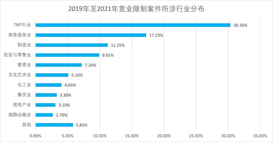 數(shù)據(jù)顯示,隨著互聯(lián)網公司的迅速發(fā)展、中國制造能力的日益提升,涉及TMT行業(yè)、制造業(yè)、商務服務業(yè)等行業(yè)依然是全國競業(yè)限制爭議案件的高發(fā)行業(yè)。