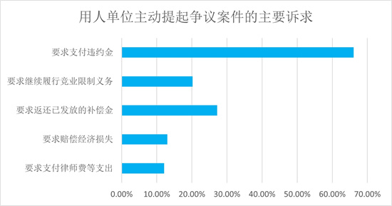 在用人單位主動提起的競業(yè)限制爭議案件中,主要訴請為要求勞動者支付違反競業(yè)限制義務違約金、繼續(xù)履行競業(yè)限制義務、返還已發(fā)放的競業(yè)限制補償金。
