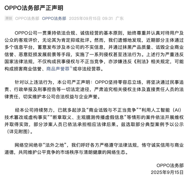 OPPO總法律顧問及首席合規(guī)官陳郴表示,今年上半年,已對多起包括“商業(yè)詆毀與不正當(dāng)競爭”“利用人工智能技術(shù)篡改或虛構(gòu)事實”“斷章取義、主觀臆測傳播虛假信息”在內(nèi)的違法案件成功開展維權(quán)行動。