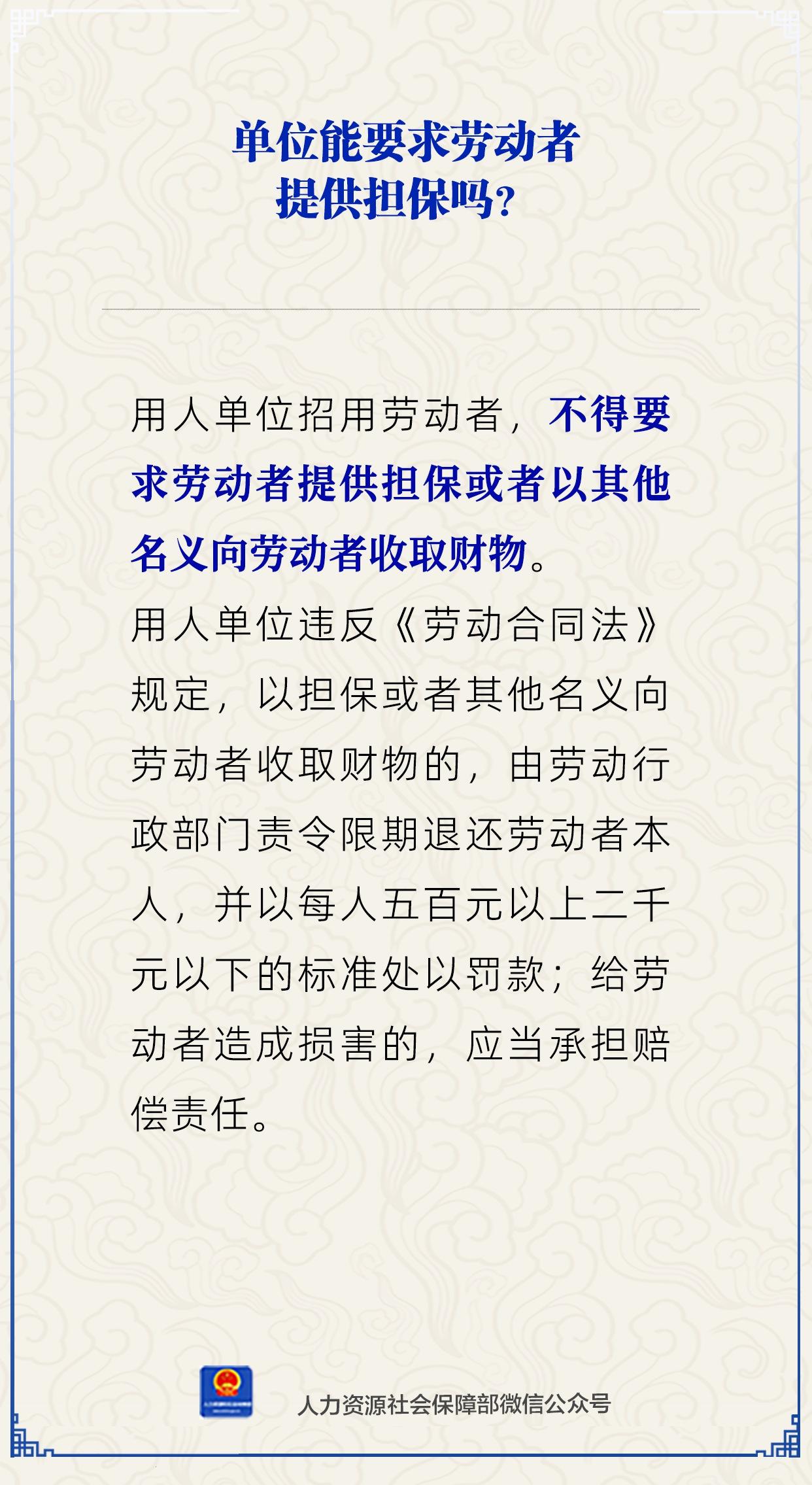 中新網(wǎng)2月27日電 單位能要求勞動者提供擔(dān)保嗎?就這一問題,人力資源和社會保障部27日在微信公眾號進(jìn)行了解讀:用人單位招用勞動者,不得要求勞動者提供擔(dān)?;蛘咭云渌x向勞動者收取財(cái)物。