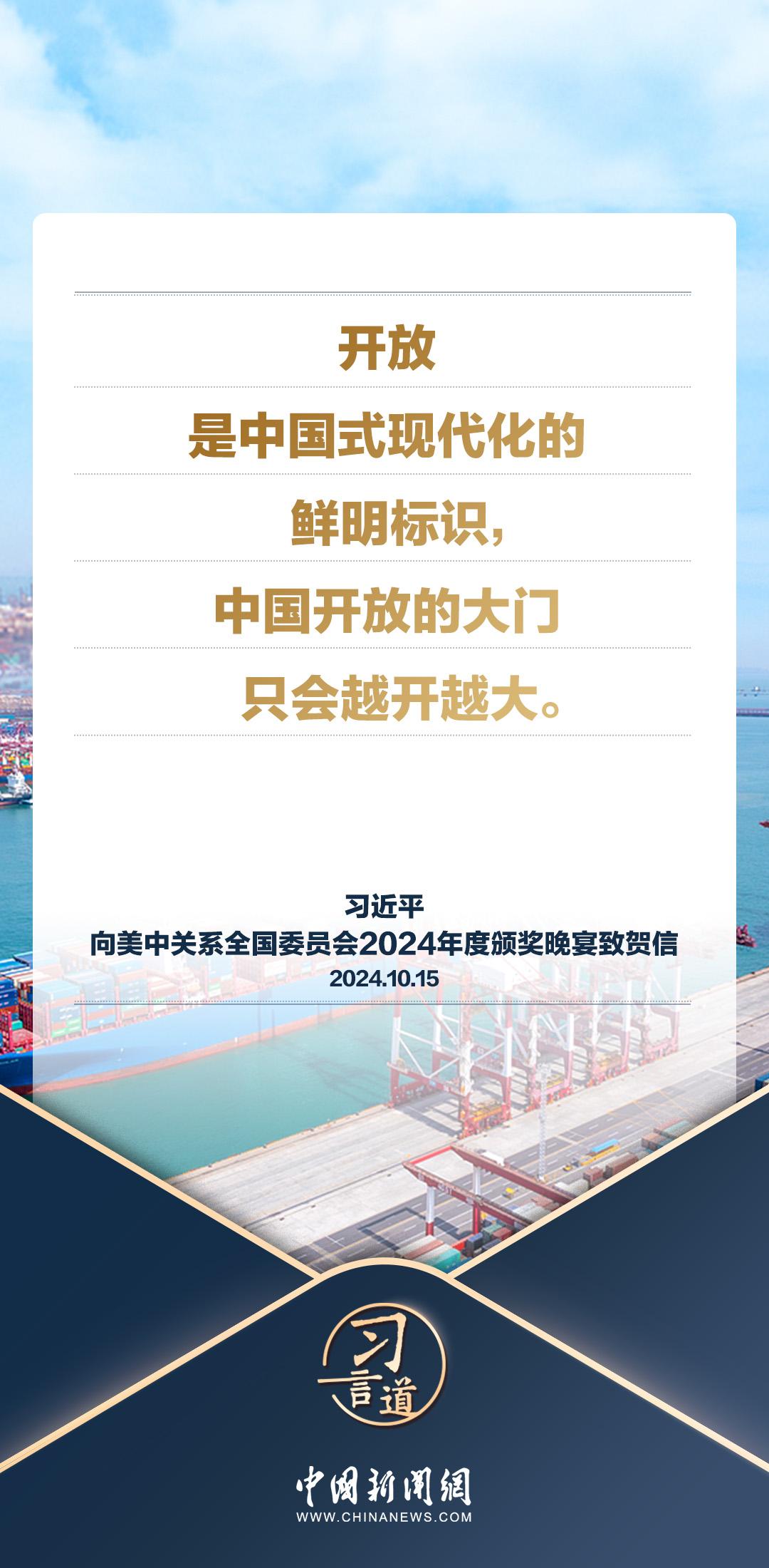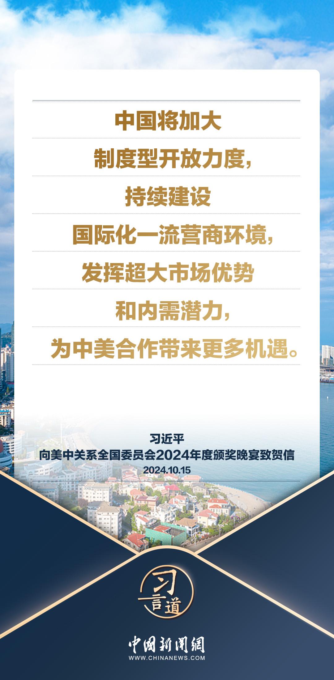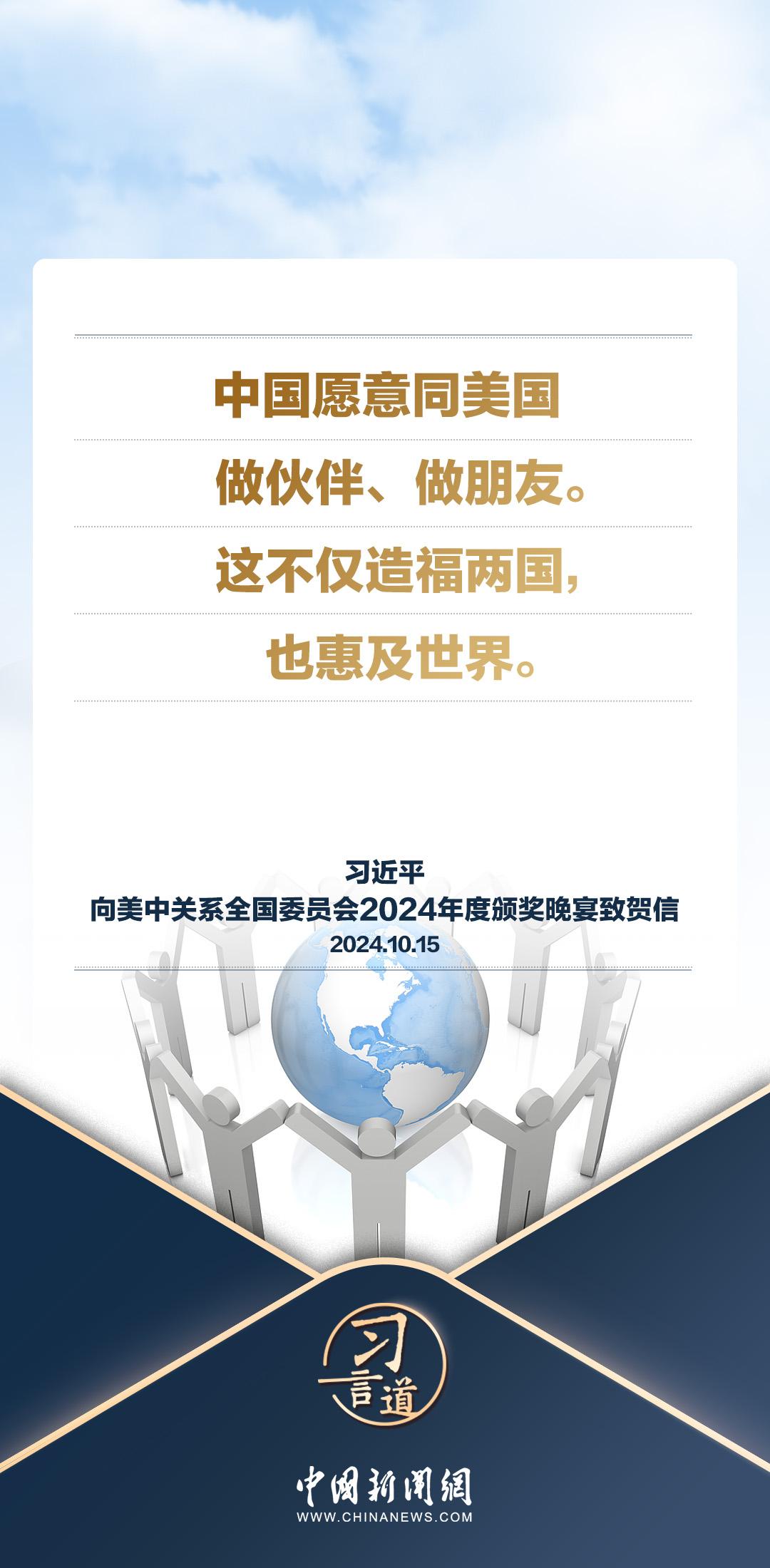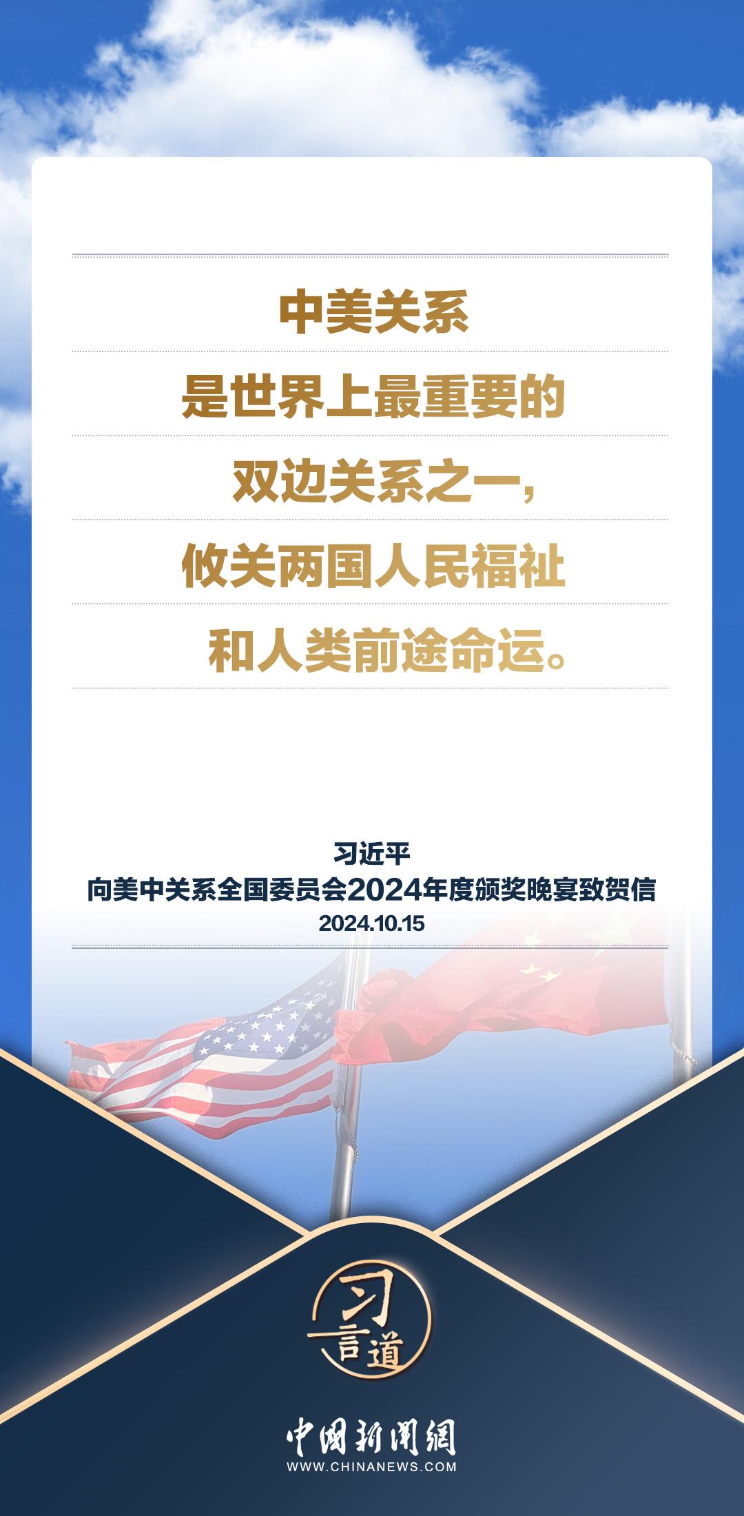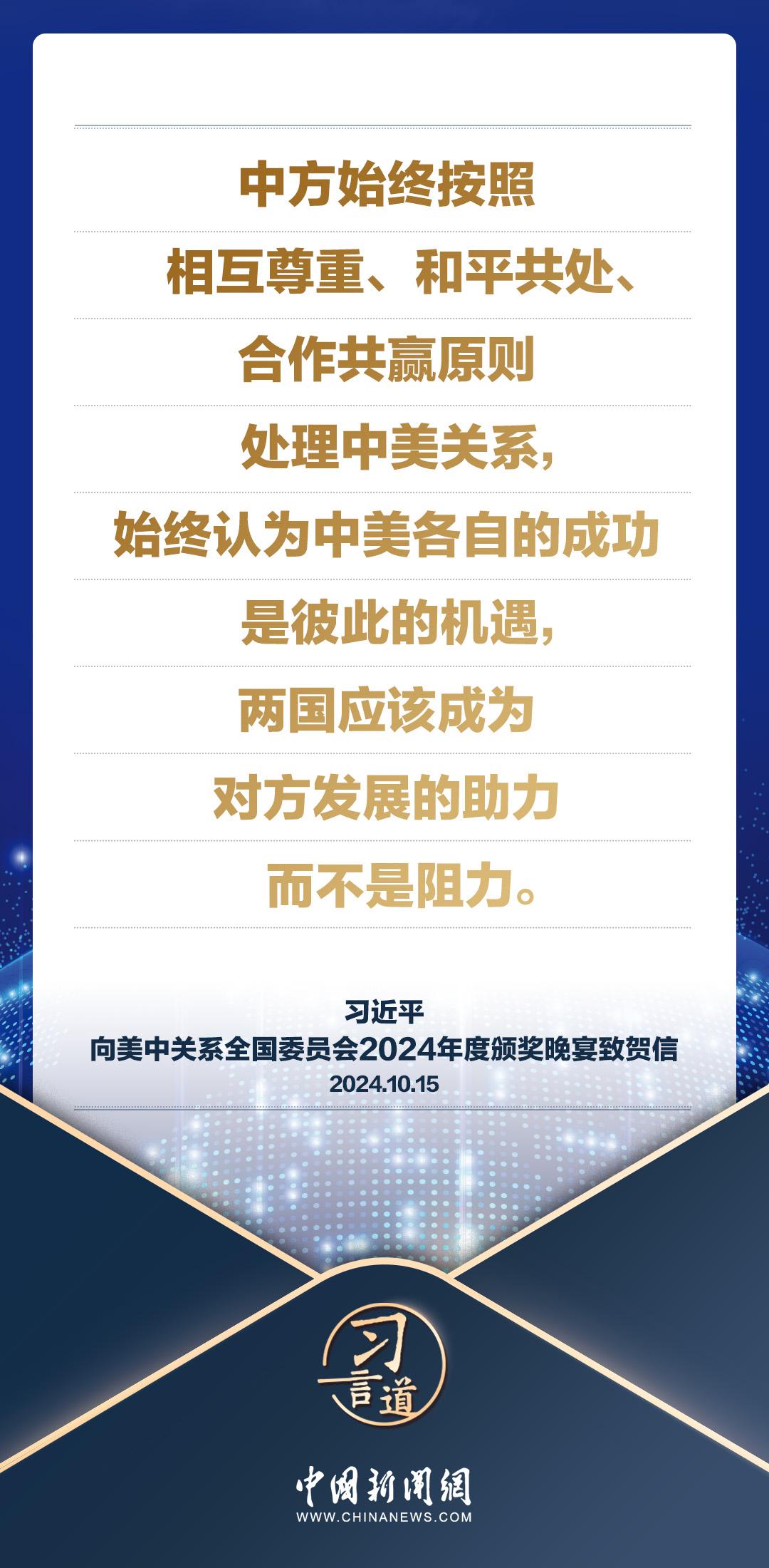 10月15日,國家主席習(xí)近平向美中關(guān)系全國委員會(huì)2024年度頒獎(jiǎng)晚宴致賀信。習(xí)近平指出——