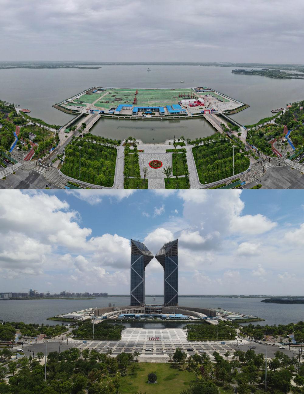 拼版照片:空中俯瞰中國(guó)(上海)自由貿(mào)易試驗(yàn)區(qū)臨港新片區(qū)滴水湖西島中銀金融中心項(xiàng)目現(xiàn)場(chǎng)(上圖為2021年6月20日攝,無(wú)人機(jī)照片;下圖為2024年8月14日攝,無(wú)人機(jī)照片)。2019年8月20日,臨港新片區(qū)揭牌成立,一個(gè)開(kāi)放新高地在長(zhǎng)江與東海交匯處日益崛起。