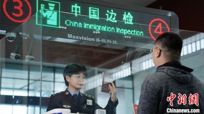 黑龍江邊檢總站綏芬河出入境邊防檢查站女民警在檢查旅客護照。吳壁輝 攝
