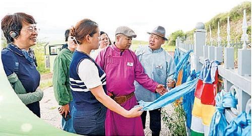 在元上都遺址內的古樹前,身著蒙古族服飾的“馬背公益守護人”向代表們介紹古樹保護情況。通訊員王中丹 攝