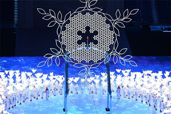 果然,北京冬奧會(huì)點(diǎn)火儀式超出了所有人的想象。開(kāi)幕式上,迪妮格爾·衣拉木江和趙嘉文兩位冰雪運(yùn)動(dòng)選手共同高舉火炬,成為北京冬奧會(huì)最后一棒火炬手。他們的身后,象征著91個(gè)參賽代表團(tuán)團(tuán)結(jié)、匯聚的雪花臺(tái)散發(fā)出耀眼光芒。在全場(chǎng)觀眾注目下,兩位年輕運(yùn)動(dòng)員一起將手持的“飛揚(yáng)”火炬嵌入雪花臺(tái)。隨后,雪花臺(tái)緩緩旋轉(zhuǎn)上升,成為北京冬奧會(huì)的主火炬。