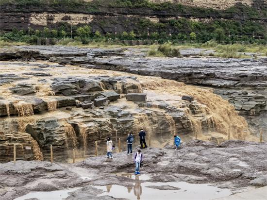 在甘肅蘭州,黃河穿城而過,城中心最著名的黃河大橋上,夜晚游人如織,兩岸霓虹夢幻,商業(yè)繁榮;在陜西宜川縣壺口瀑布景區(qū),咆哮如雷的巨大水流彰顯著黃河的力量;在山東東營黃河入海口,流動的河水如舒緩的交響曲,深情地告別大地,流向海洋。那金黃的河水與湛藍的海水交匯,藍黃分明,久久不愿融合。岸邊大片的灘涂被保護起來,豐富的植被和水草,令吸引候鳥前來安家。