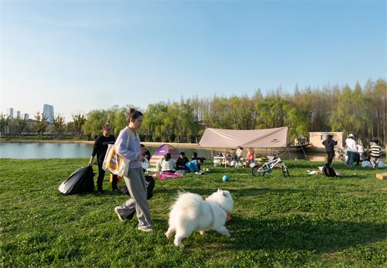 4 月 2 日,蘇州,隨著天氣轉暖,市民湖邊露營休閑