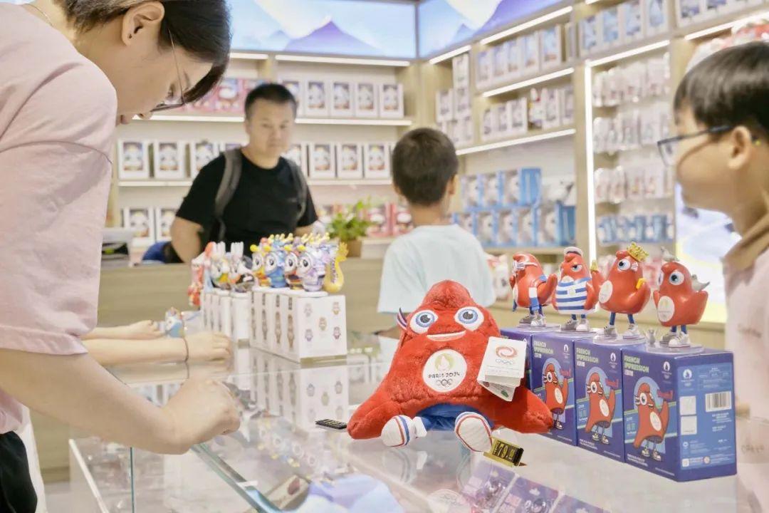 ▲7月6日,北京奧運(yùn)博物館文創(chuàng)店內(nèi)游客正在選購(gòu)2024年奧運(yùn)吉祥物紀(jì)念品 宋逗/攝