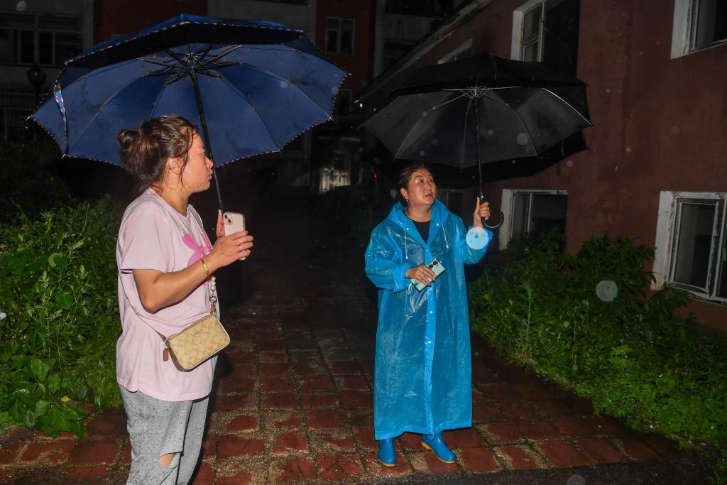 7月29日,在吉林省臨江市,建國街道臺興社區(qū)黨委書記孫愛武(右)和同事在怡景花園小區(qū)排查人員安置情況。新華社記者 張楠 攝