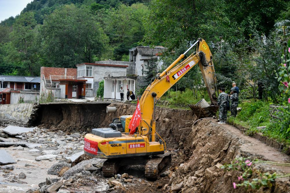 7月28日,在隴南市武都區(qū)黃坪鎮(zhèn)樓房壩村,黃坪鎮(zhèn)組織的搶險(xiǎn)救援隊(duì)正在搶修受損農(nóng)村公路。新華社記者 郎兵兵 攝