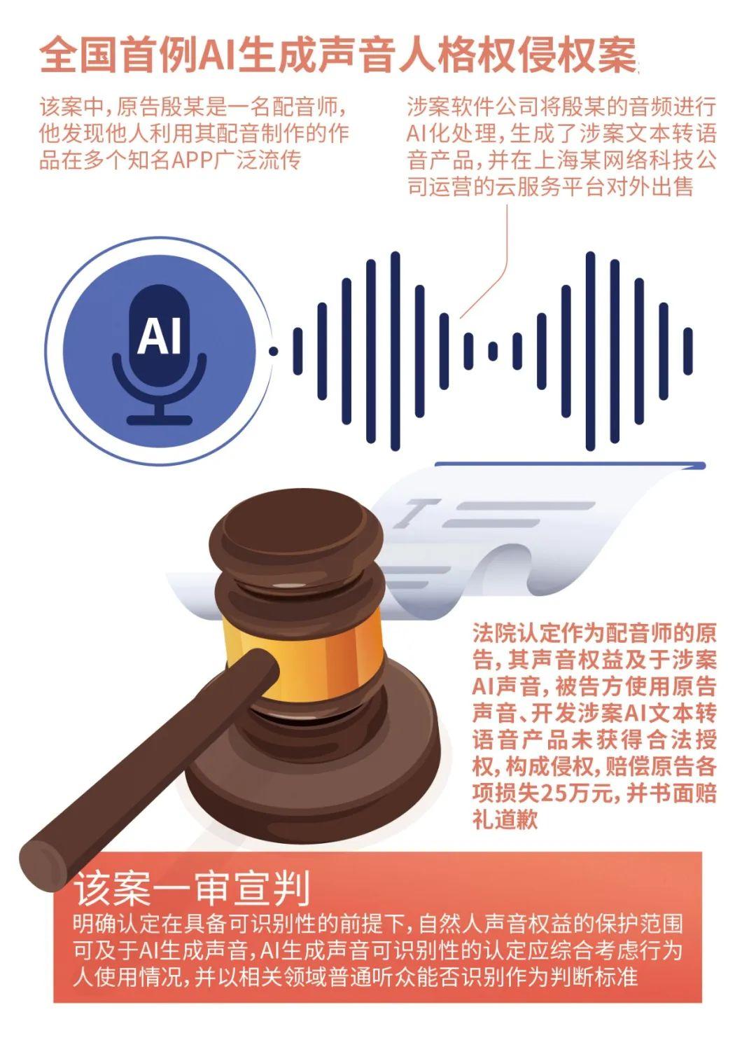 2024年4月,北京互聯(lián)網法院一審開庭宣判了全國首例AI生成聲音人格權侵權案,明確認定在具備可識別性的前提下,自然人聲音權益的保護范圍可及于AI生成聲音。同時,AI生成聲音可識別性的認定應綜合考慮行為人使用情況,并以相關領域普通聽眾能否識別作為判斷標準。