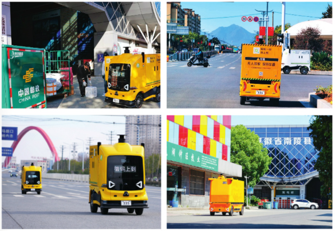 ▲在安徽省南陵縣道路上行駛的無(wú)人快遞車(chē),實(shí)現(xiàn)從快遞終點(diǎn)站到小區(qū)快遞驛站“最后一公里”的快遞轉(zhuǎn)運(yùn)。受訪(fǎng)者供圖