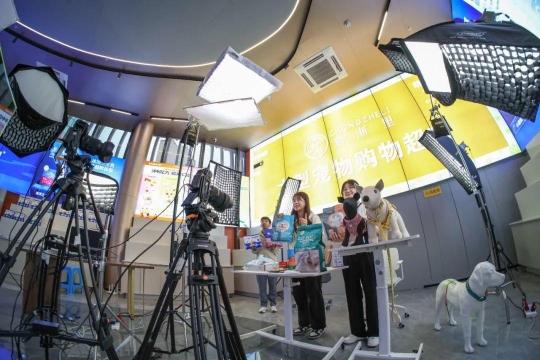▲互聯(lián)網(wǎng)營(yíng)銷師培訓(xùn)機(jī)構(gòu)水平參差不齊。圖為浙江省平陽縣寵物小鎮(zhèn)客廳內(nèi),眾多主播直播帶貨。 CFP