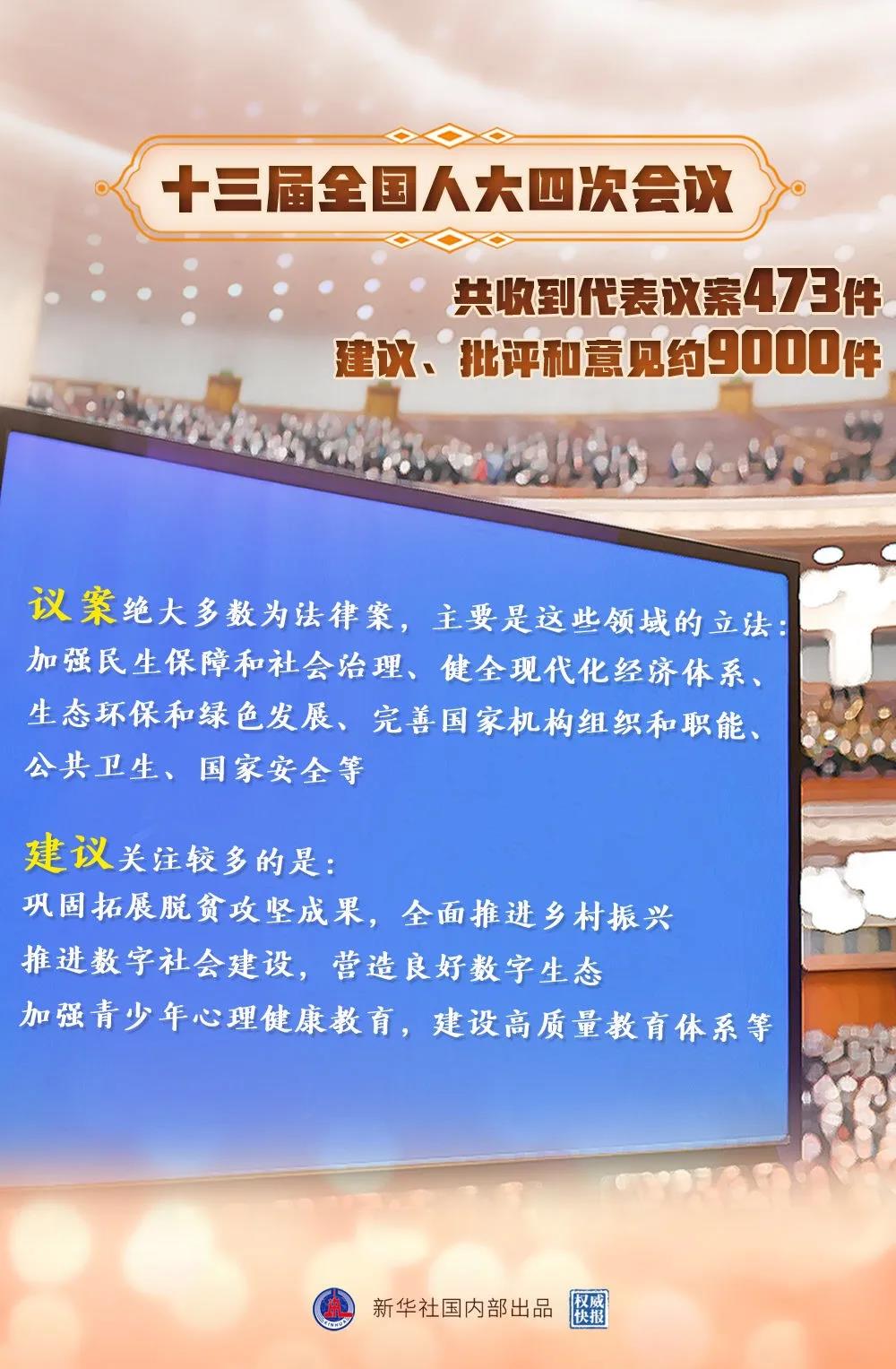 代表建議關(guān)注較多的問題主要有:鞏固拓展脫貧攻堅(jiān)成果,全面推進(jìn)鄉(xiāng)村振興;加強(qiáng)知識產(chǎn)權(quán)綜合保護(hù),提升企業(yè)技術(shù)創(chuàng)新能力;強(qiáng)化國家戰(zhàn)略科技力量,補(bǔ)齊產(chǎn)業(yè)鏈供應(yīng)鏈短板;推進(jìn)數(shù)字社會(huì)建設(shè),營造良好數(shù)字生態(tài);解決好種子和耕地問題,保障糧食安全;推動(dòng)綠色低碳發(fā)展,持續(xù)改善環(huán)境質(zhì)量;加強(qiáng)青少年心理健康教育,建設(shè)高質(zhì)量教育體系;深化醫(yī)藥衛(wèi)生體制改革,加快中醫(yī)藥特色發(fā)展;加快完善養(yǎng)老和托育服務(wù)體系,積極應(yīng)對人口老齡化。