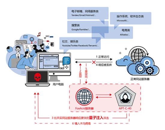 量子攻擊系統(tǒng)主要針對國家級網(wǎng)絡(luò)通信進(jìn)行中間劫持,以實(shí)施漏洞利用、通信操控、情報竊取等一系列復(fù)雜網(wǎng)絡(luò)攻擊。這位研究人員指出,“量子攻擊可以劫持全世界任意地區(qū)任意上網(wǎng)用戶的正常網(wǎng)頁瀏覽流量,進(jìn)行0day(零日)漏洞利用攻擊并遠(yuǎn)程植入后門程序?!?/span>