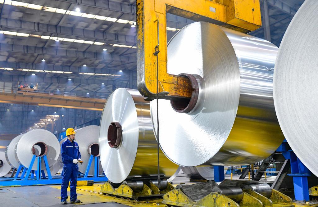 內(nèi)蒙古霍林郭勒市一家鋁業(yè)公司,工人在鋁箔生產(chǎn)線上作業(yè)。新華社發(fā)(王正 攝)