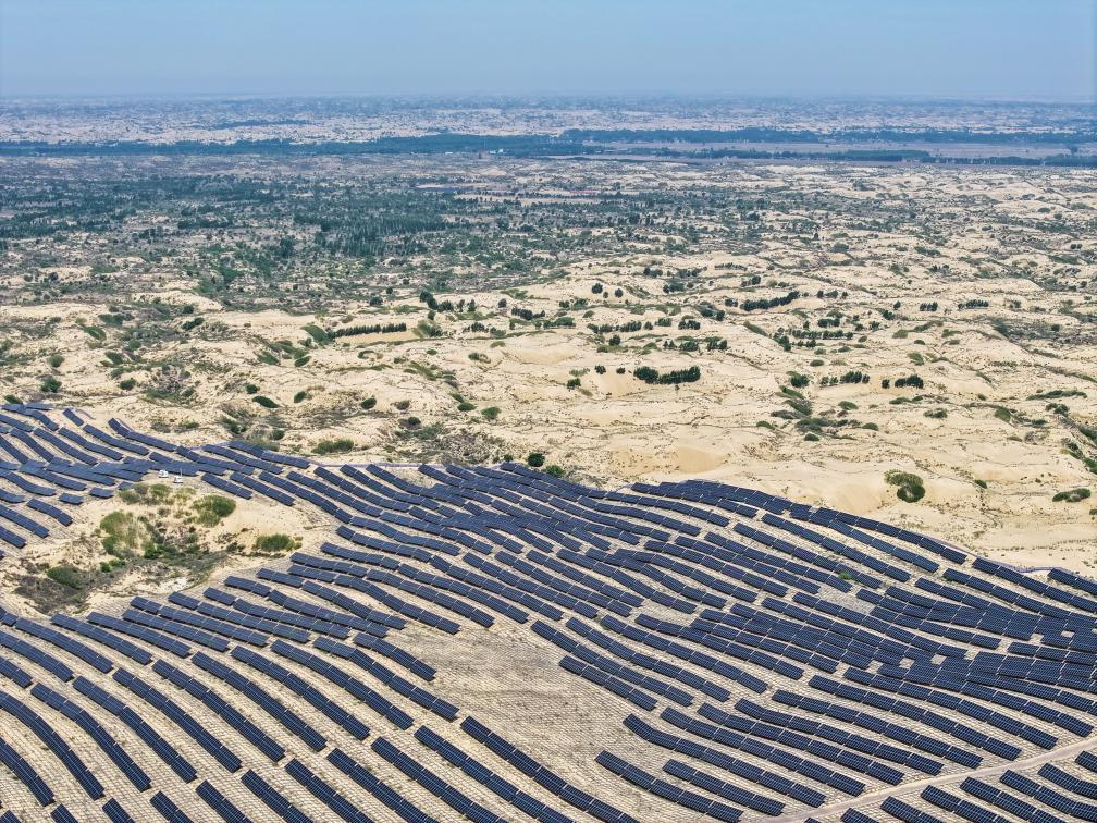 在內(nèi)蒙古科爾沁、渾善達克兩大沙地,光伏發(fā)電板整齊排列,昔日沙海正變身“藍?!??!傲幍?030年,內(nèi)蒙古防沙治沙和風電光伏一體化項目新能源裝機達到1.19億千瓦,綜合治理沙化土地1151萬畝?!眱?nèi)蒙古自治區(qū)能源局黨組成員、副局長陳錚介紹,截至5月底,內(nèi)蒙古新能源總裝機規(guī)模達到10158萬千瓦,成為全國第一個新能源總裝機突破1億千瓦的省份,新能源發(fā)電量達到1063億千瓦時,相當于減少標準煤消費3295.3萬噸,減少二氧化碳排放8759.12萬噸。