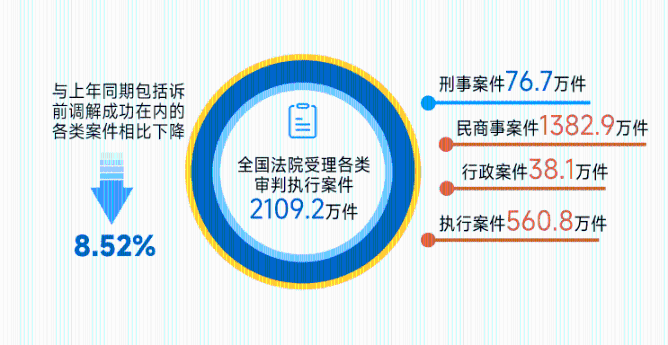 人民網(wǎng)北京7月22日電 (薄晨棣、高清揚)21日,最高人民法院公布2025年上半年司法審判工作主要數(shù)據(jù)。數(shù)據(jù)顯示,2025年上半年,全國法院受理各類審判執(zhí)行案件2109.2萬件,其中刑事案件76.7萬件,民商事案件1382.9萬件,行政案件38.1萬件,執(zhí)行案件560.8萬件,與上年同期包括訴前調(diào)解成功在內(nèi)的各類案件相比下降8.52%。