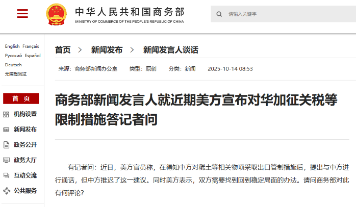 有記者問:近日,美方官員稱,在得知中方對稀土等相關(guān)物項(xiàng)采取出口管制措施后,提出與中方進(jìn)行通話,但中方推遲了這一建議。同時美方表示,雙方需要找到回到穩(wěn)定局面的辦法。請問商務(wù)部對此有何評論?