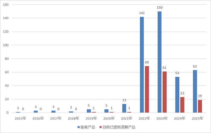 圖:博潤銀泰投資旗下各年度備案的產(chǎn)品情況(2025年的數(shù)據(jù)截至9月16日)