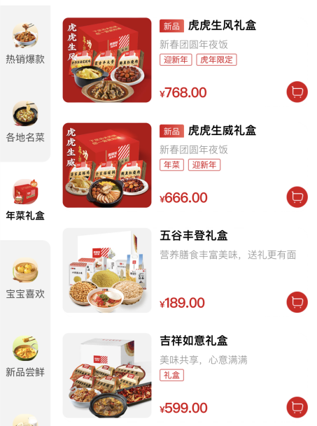 記者進入商城發(fā)現(xiàn),西貝莜面村推出的“預制菜年夜飯”禮盒種類繁多,包含蒙古牛大骨、全家福暖鍋、功夫羊雜湯等。除固定禮盒外,還推出“金湯深?;z雞”“鮑魚紅燒肉”等單品菜,價格均為299元。