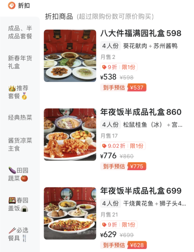 同春園一名工作人員告訴記者,美團、大眾點評等團購APP上的“預制菜年夜飯”套餐,因平臺打折,菜價比餐廳堂食價格便宜許多。如“松鼠桂魚”,餐廳堂食價格每斤158元,“預制菜年夜飯”套餐價格更低。上述工作人員稱,“預制菜年夜飯”的菜品口味,一定不如在餐廳享用。因為半成品非真空包裝,有的菜需要拿回去化凍后,再炸一次,口感自然比堂食效果差?!?/span>