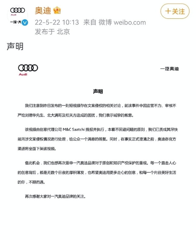 5月22日上午,奧迪承認(rèn)文案涉侵權(quán),并發(fā)布致歉聲明稱,已對該情況進行處理,會給公眾滿意答復(fù),同時全面下架相關(guān)視頻。同日午間,奧迪小滿篇品牌視頻開發(fā)團隊所屬公司,上思廣告發(fā)布聲明,向劉德華、“北大滿哥”及奧迪致歉,并承諾盡最大努力彌補對原作者的損失。