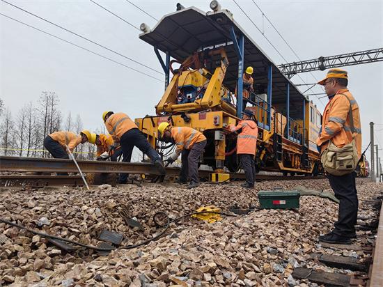 2月19日9時許,京滬鐵路上行線江蘇段下蜀站至南京東站區(qū)間,工長劉志斌正手拿對講機,雙眼緊盯著線路上正在緩緩?fù)七M的HGCZ-2000型快速換軌車。