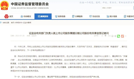 監(jiān)管部門顯然注意到這股“離婚熱”帶來的負面影響。7月28日,證監(jiān)會有關(guān)部門負責人就上市公司股東離婚分割公司股份有關(guān)事宜答記者問時明確表示,股份減持是股東享有的基本權(quán)利,但上市公司大股東(即控股股東、持股5%以上股東)、董監(jiān)高作為“關(guān)鍵少數(shù)”,在公司經(jīng)營發(fā)展、治理運行中負有專門義務(wù)和特殊責任,應(yīng)當切實維護上市公司和中小股東利益,自覺規(guī)范減持行為,不得以離婚、解散清算、分立等任何方式規(guī)避減持限制。