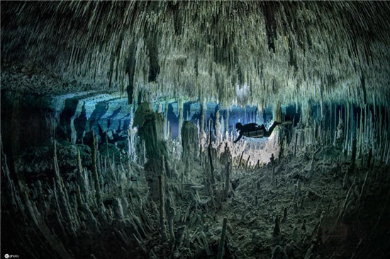 8月4日,水下攝影師Martin Broen在墨西哥尤卡坦半島拍攝的水下洞穴。這些洞穴由多孔石灰?guī)r基巖坍塌形成,在太陽光或探照燈的照射下,形成各種顏色的反光,如科幻電影,神秘無比。