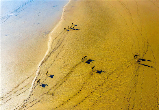 盛夏時節(jié),江蘇省東臺市條子泥海濱,野生麋鹿在灘涂沙洲上嬉戲,成為一道美麗風景。