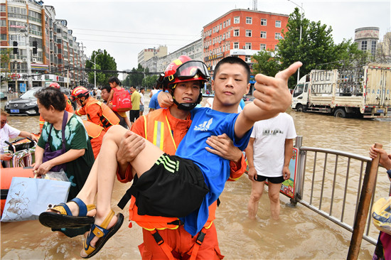 7月22日,河南鄭州遭暴雨突襲,鄭州市鄭東新區(qū)白沙鎮(zhèn)寬豪斯小區(qū)門口,一名殘障男子在江西消防救援人員懷里豎起了大拇指。