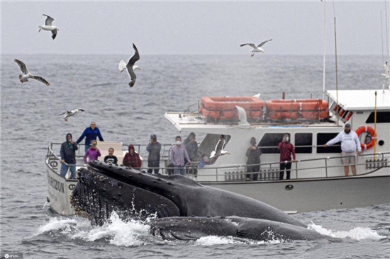 8月3日,美國加州蒙特利灣,4頭座頭鯨和海鷗為了爭奪隱藏在船下的鳳尾魚,浮出水面,和船只僅有咫尺距離。