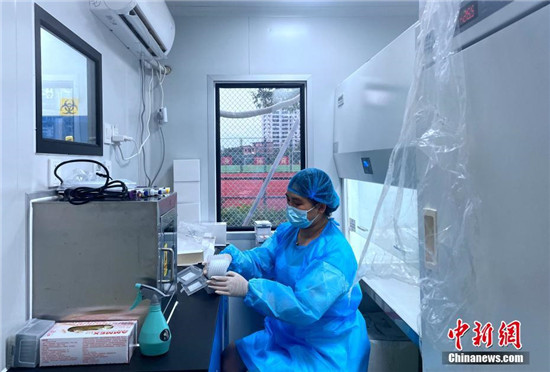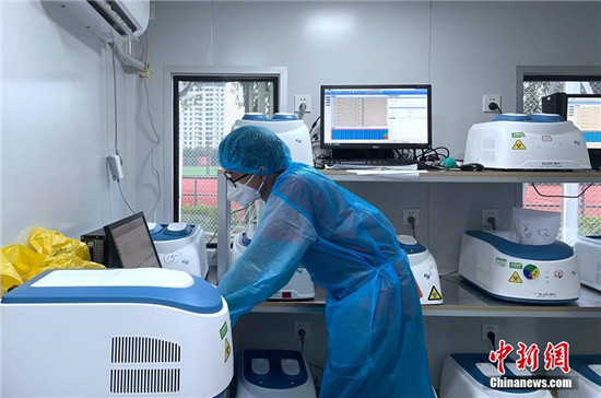 9月14日,工作人員在移動(dòng)PCR方艙實(shí)驗(yàn)室里工作。當(dāng)日,福建省莆田市仙游縣方艙核酸檢測(cè)點(diǎn)7個(gè)方艙實(shí)驗(yàn)室已有三個(gè)投入使用。據(jù)檢測(cè)點(diǎn)負(fù)責(zé)人介紹,7個(gè)方艙實(shí)驗(yàn)室、85臺(tái)PCR檢測(cè)儀器投入使用后,預(yù)計(jì)每天可檢測(cè)8萬(wàn)到10萬(wàn)管核酸樣本;若按10:1核酸混合采樣,預(yù)計(jì)每天可為80萬(wàn)到100萬(wàn)人提供核酸樣本檢測(cè)。截至9月13日24時(shí),莆田市累計(jì)報(bào)告新冠病毒核酸陽(yáng)性85例(均在仙游縣),其中確診病例64例、無(wú)癥狀感染者21例。 中新社記者 張斌 攝
