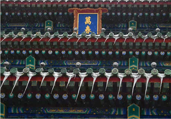 景山萬春亭的屋檐掛著整齊的冰凌。