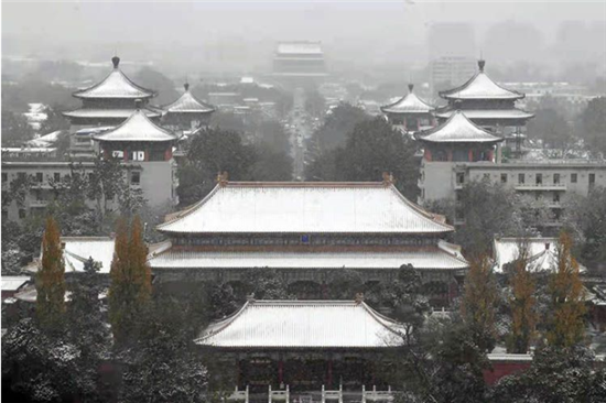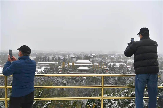 11月7日,立冬,距2022北京冬奧會開幕還有89天之際,北京城迎來初雪。人們登上景山俯瞰故宮、中軸線,紅墻、黃瓦被覆蓋上皚皚白雪,換上美麗“冬裝”的古城已變身為冬奧之城。