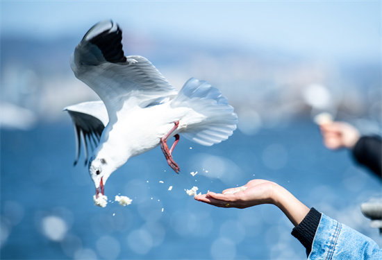 1月23日,云南昆明。滇池海埂大壩游人如織,一只紅嘴鷗從游人手中取食。