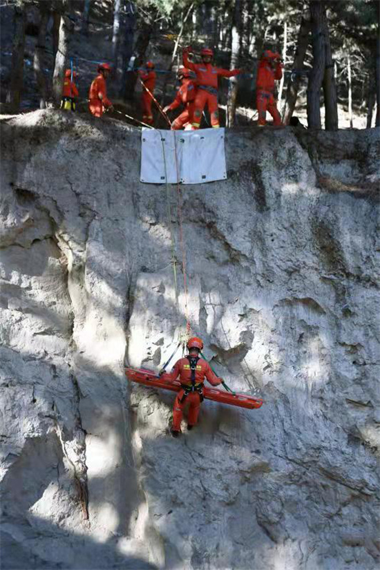 1月20日,駐守在甘肅省甘南藏族自治州迭部縣的森林消防員開展森林滅火、豎井救援、懸崖向上救援、頂撐與狹小空間破拆等綜合消防救援演練。