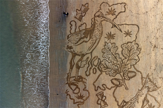 3月23日,英國(guó)英格蘭北部的斯卡伯勒,藝術(shù)家們?cè)谒箍ú蘸┥蟿?chuàng)作一幅大型沙畫,描繪橡樹葉、鮭魚和海貍等自然物種,繪制成英國(guó)地圖形狀。該作品由英國(guó)青年自然組織和皇家鳥類保護(hù)協(xié)會(huì)合作而成,象征著年輕人對(duì)英國(guó)野生動(dòng)物生存現(xiàn)狀的擔(dān)憂。