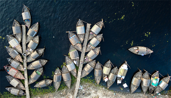 孟加拉達(dá)卡Shitalakshya河上,船只整齊地排列在碼頭上,看起來(lái)就像樹葉或花瓣。